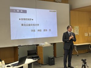 はじめに、やまがた社会共創プラットフォーム会長(山形大学長)の 玉手 英利 氏(事前録画)、会場校より東北公益文科大学長(やまぷら副会長)の 神田 直弥 氏の両名より、ご挨拶を頂戴しました。