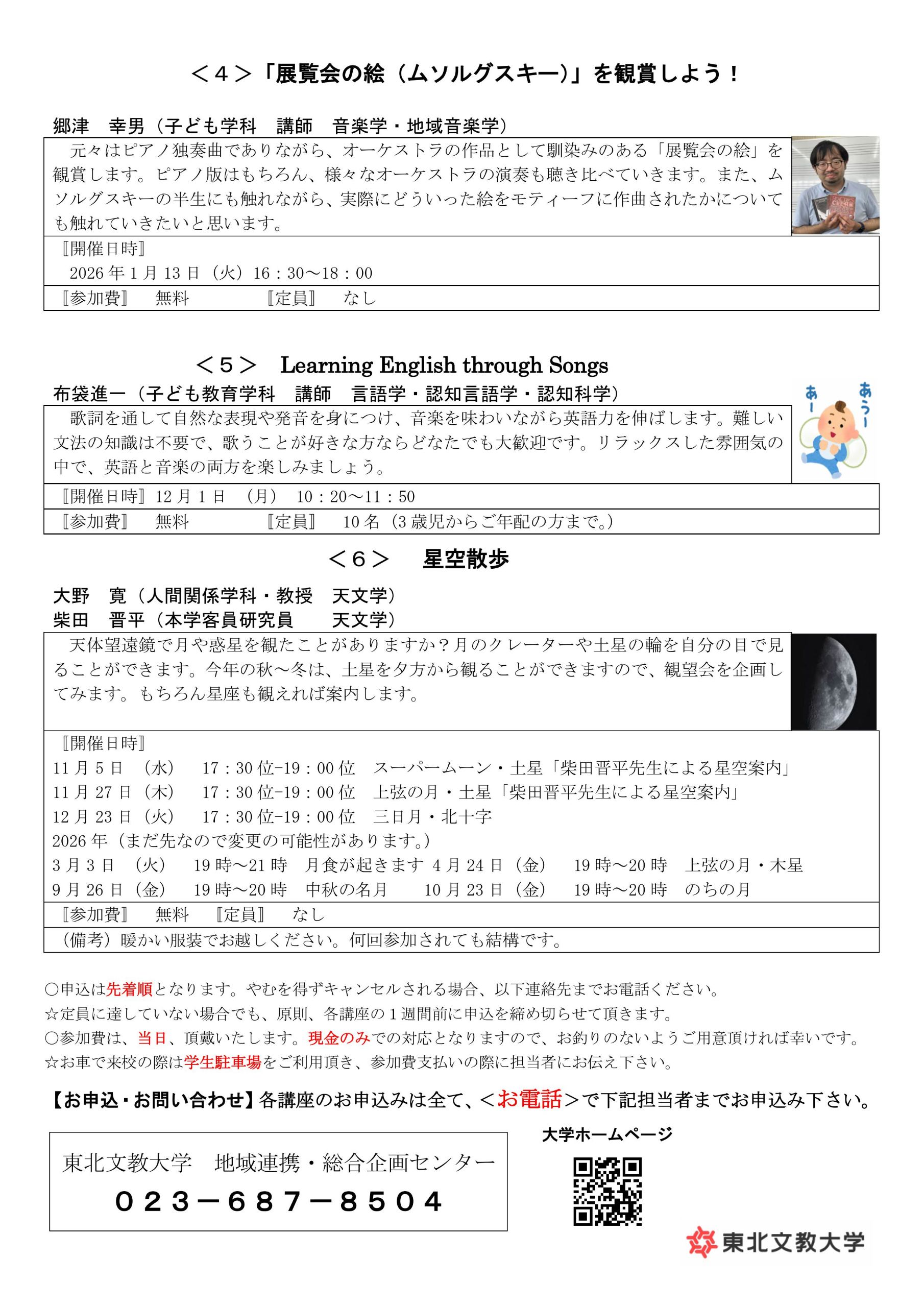 | 申込み方法 | お電話にてお申し込みください。 東北文教大学 地域連携・総合企画センター TEL:023-687-8504 |